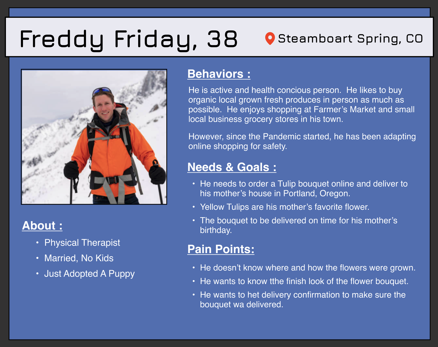 “ User needs a way to order fresh flowers online with a national delivery option as well as having access to detailed information about the flowers source and origin, because he lives out of state and values sustainability and quality highly.”